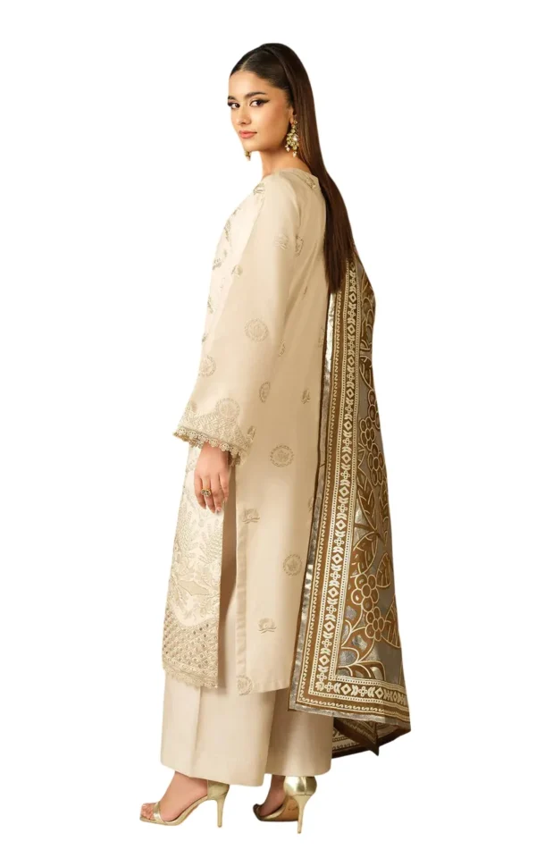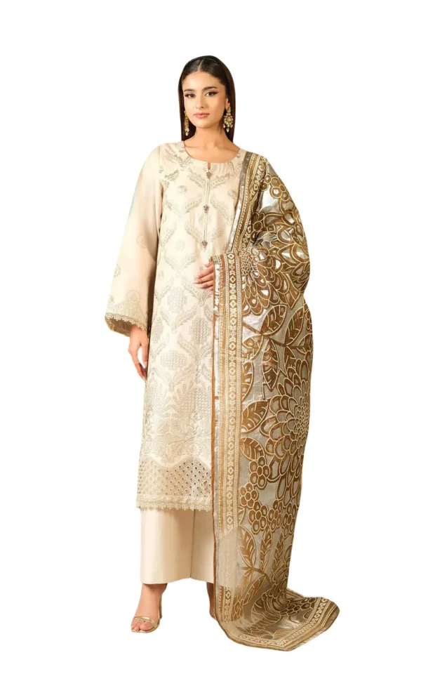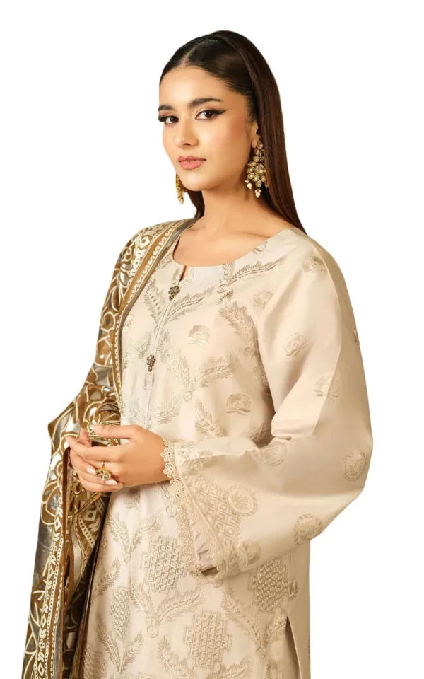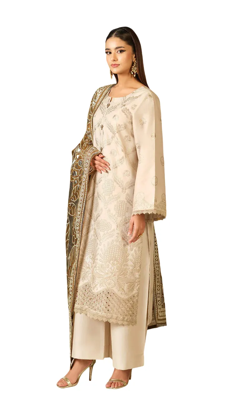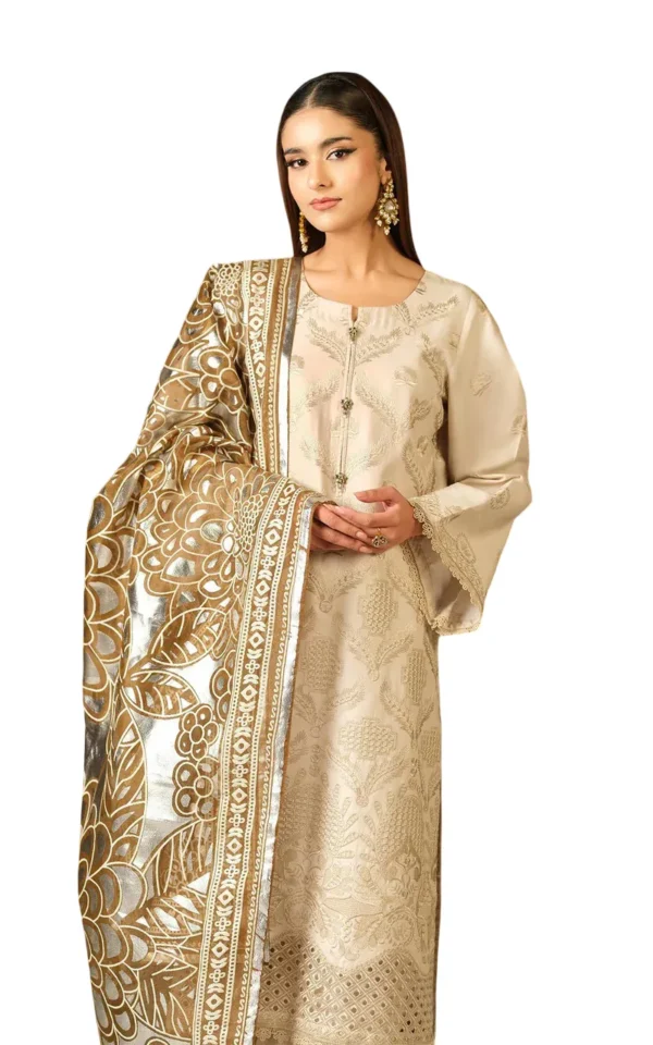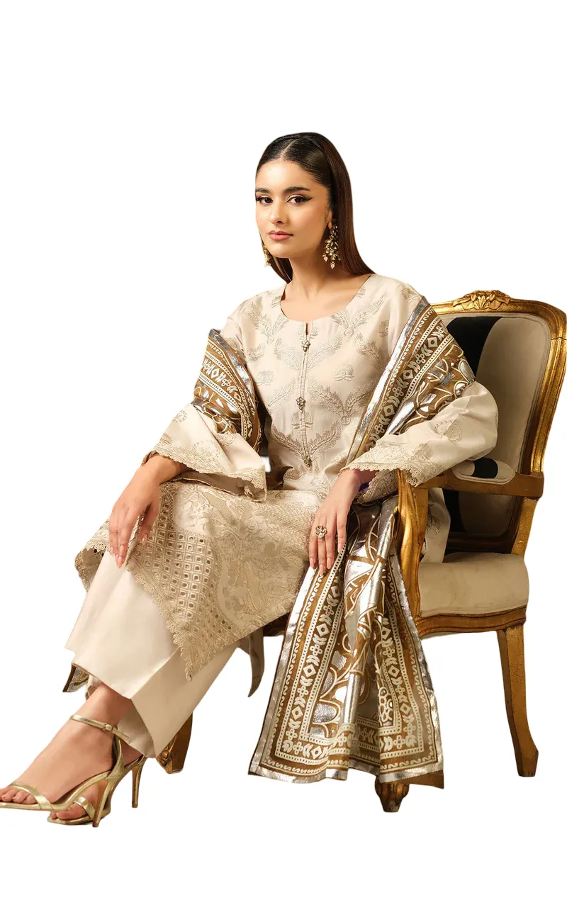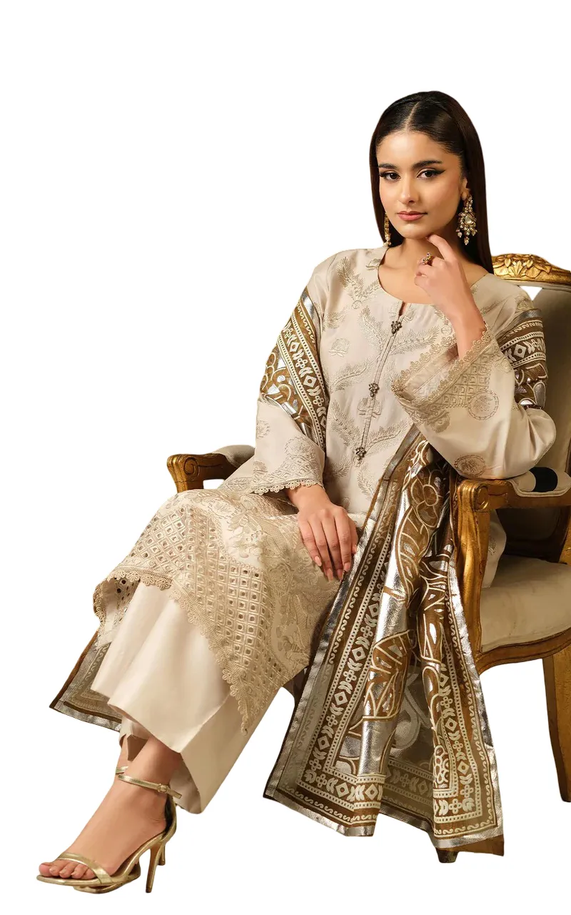 This set includes two beautifully designed dupattas: a Bareeze Net foil-printed dupatta for a festive touch, and a Silk digital printed dupatta adorned with elegant lace detailing, offering versatile styling options.
