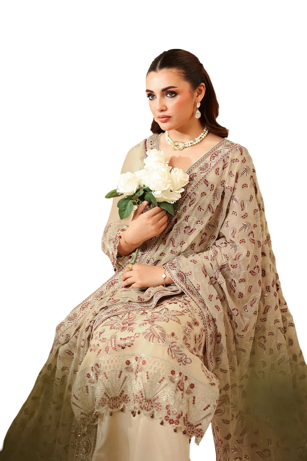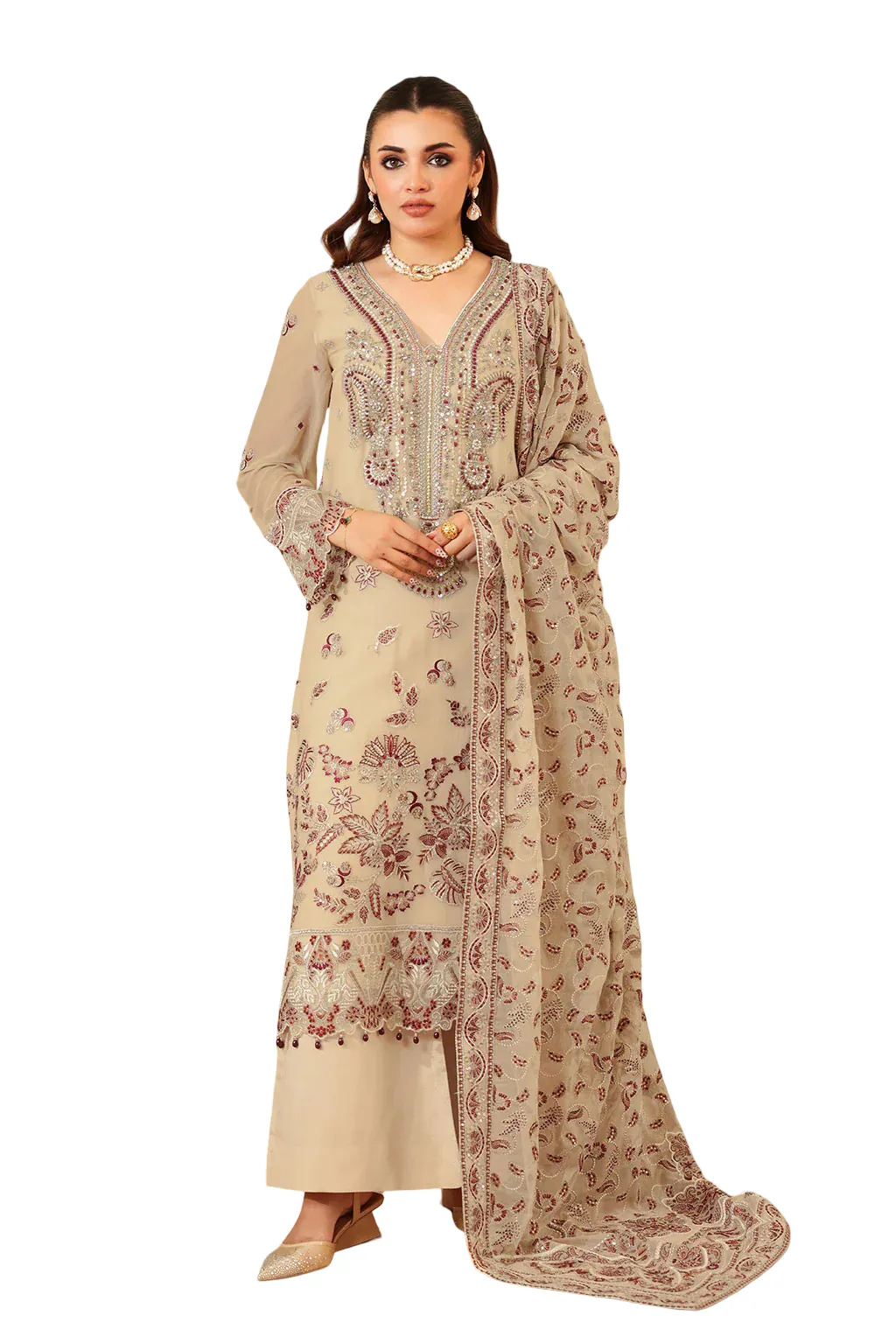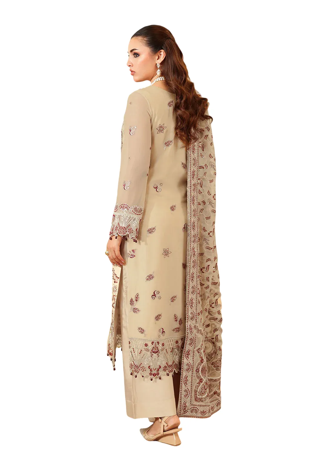 Chiffon Embroidered Front with Sequence Organza Embroidered Neckline Patch with Hand Embellishment Chiffon Embroidered Back Organza Embroidered Border (Front & Back) Chiffon Embroidered Sleeves Organza Embroidered Sleeves Border Chiffon Embroidered Shawl Raw Silk Trouser   This dress is custom-tailored based on your chosen size. Due to the made-to-order nature of this product, returns are not possible unless there is a defect or fault. We thoroughly check every item before dispatch to ensure it meets our quality standards.