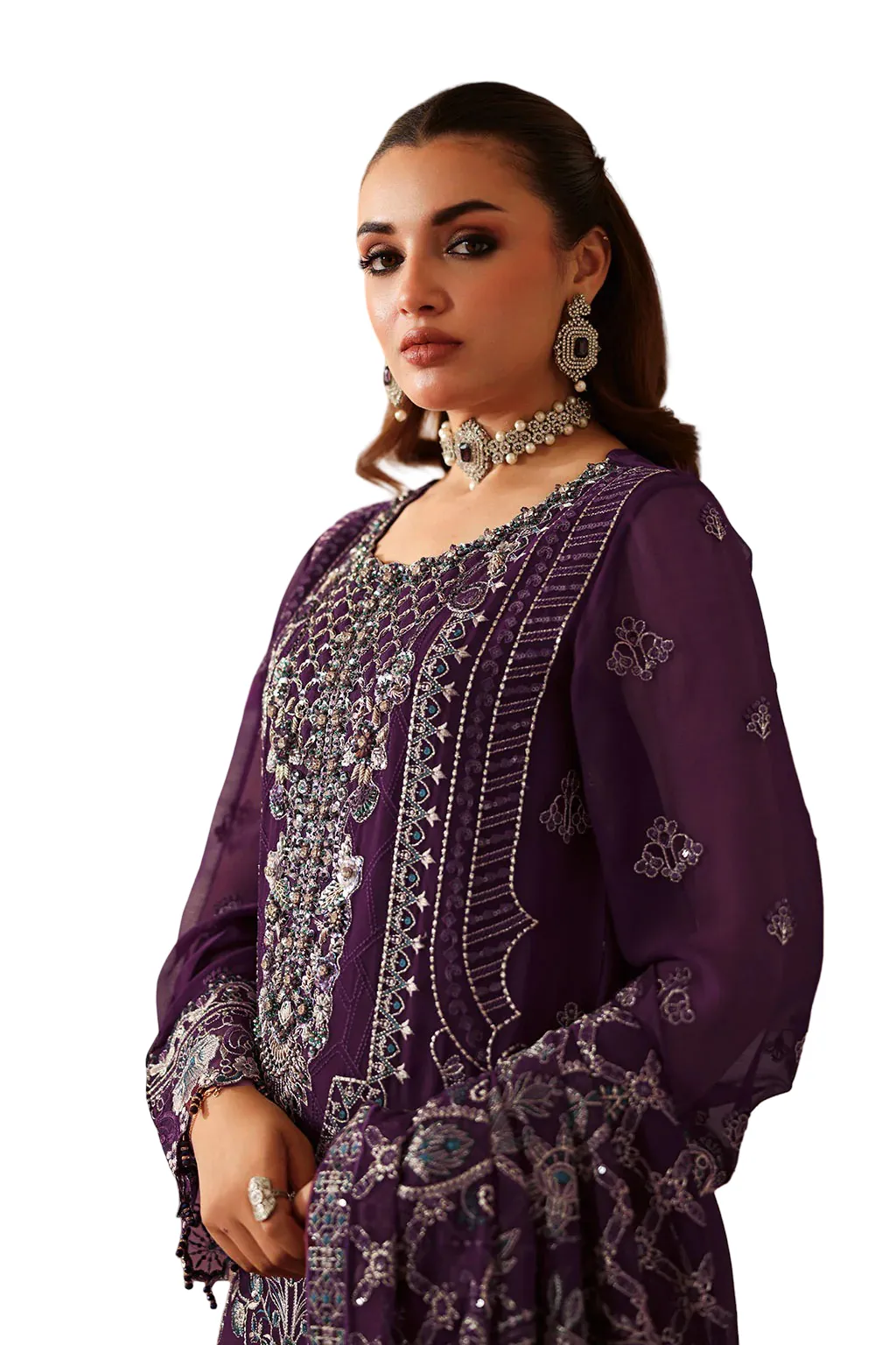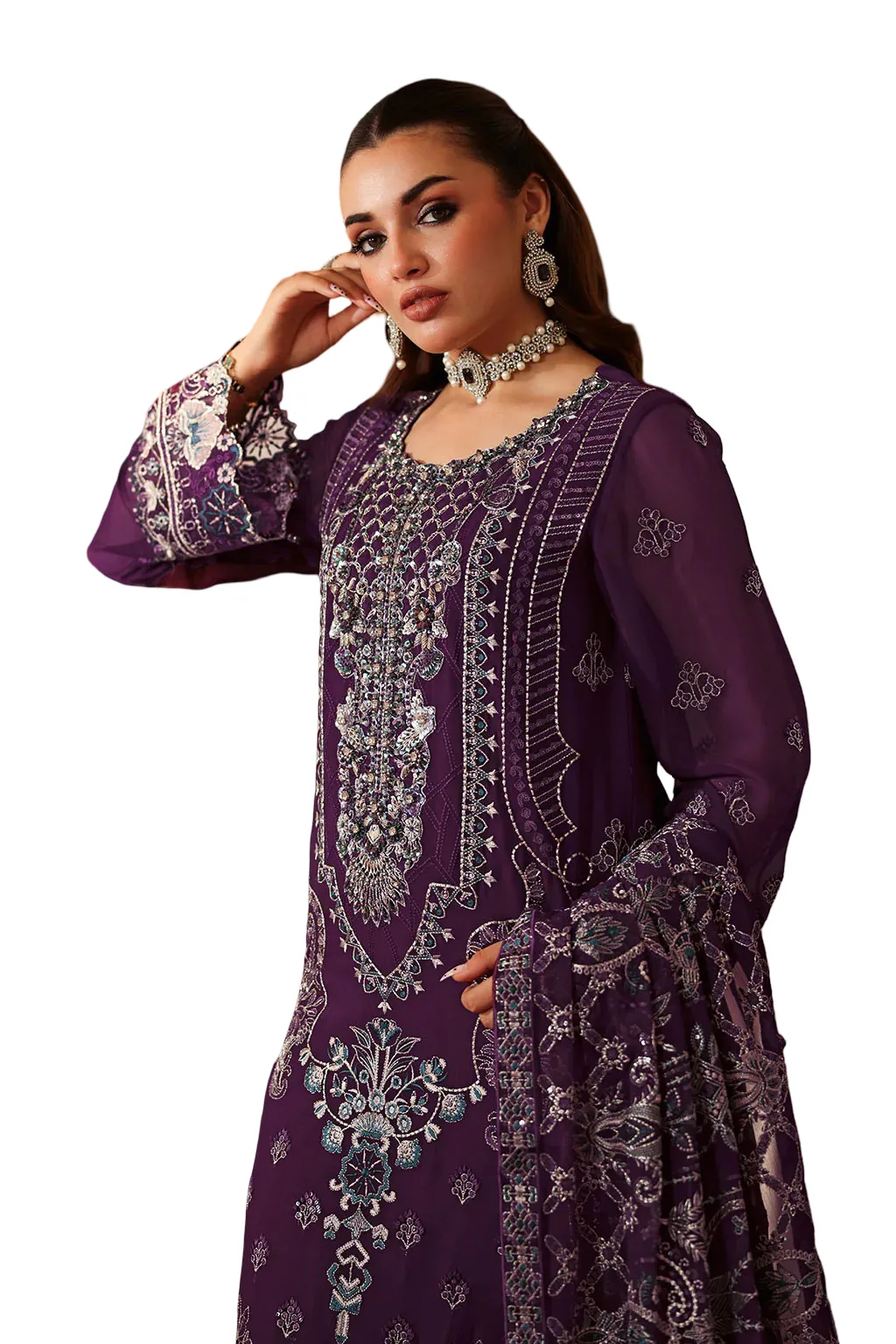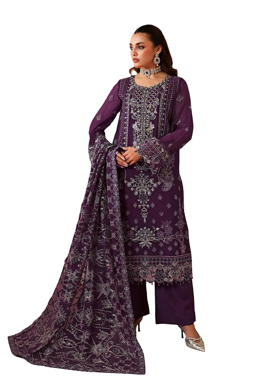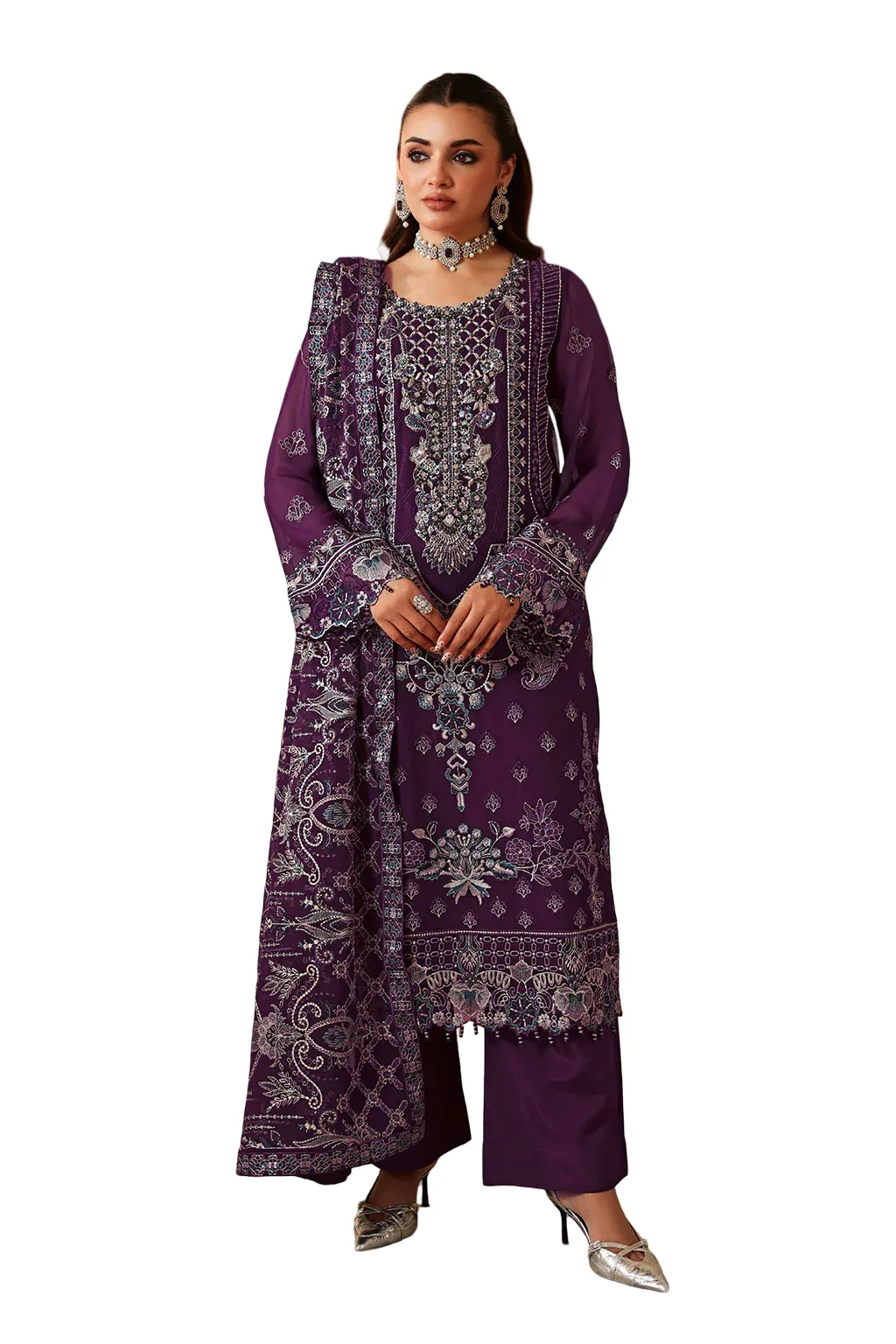 Chiffon Embroidered Front with Sequence Organza Embroidered Neckline Patch with Hand Embellishment Chiffon Embroidered Back Organza Embroidered Border (Front & Back) Chiffon Embroidered Sleeves Organza Embroidered Sleeves Border Chiffon Embroidered Shawl Raw Silk Trouser   This dress is custom-tailored based on your chosen size. Due to the made-to-order nature of this product, returns are not possible unless there is a defect or fault. We thoroughly check every item before dispatch to ensure it meets our quality standards.