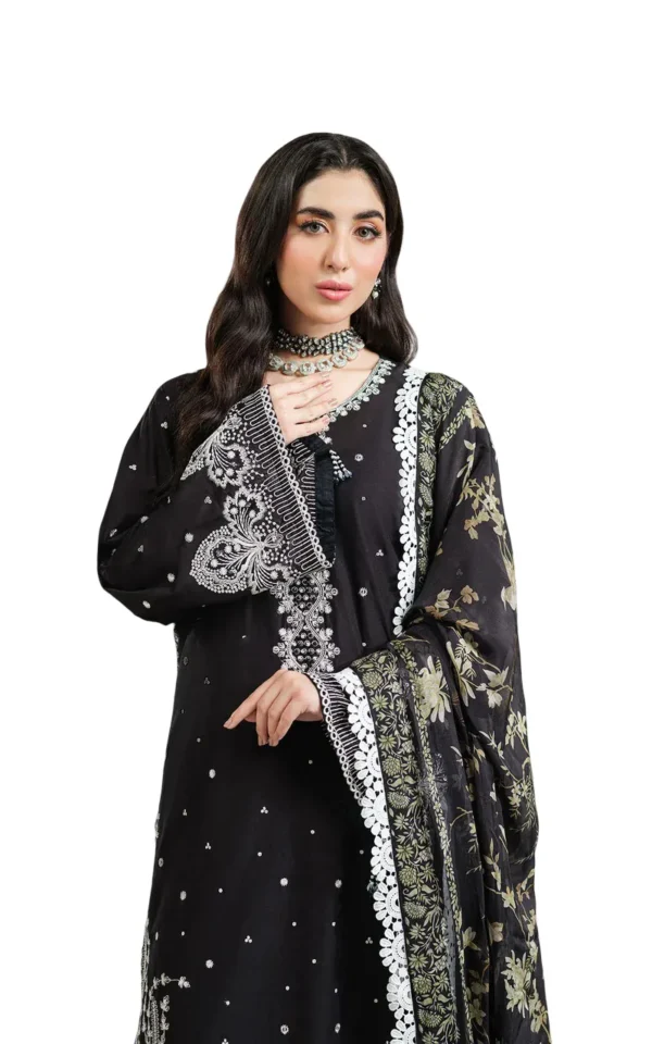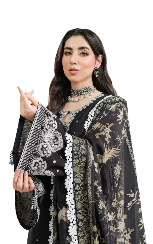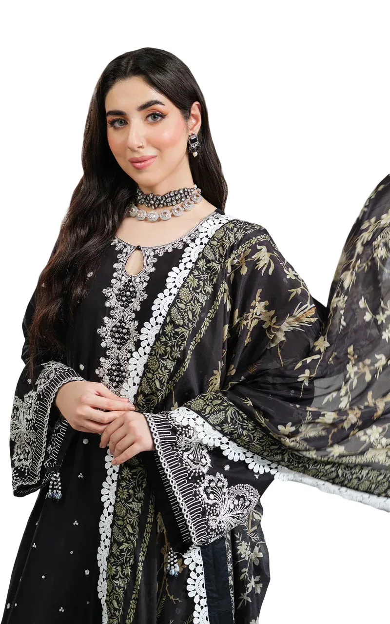 Crafted from premium viscose fabric, this shirt offers a soft texture with an elegant drape. It features intricate full embroidery throughout, including the arms, sleeves, and daman. The daman is beautifully designed in a delicate cutwork style and further enhanced with subtle embellishments, adding depth and sophistication to the overall look.